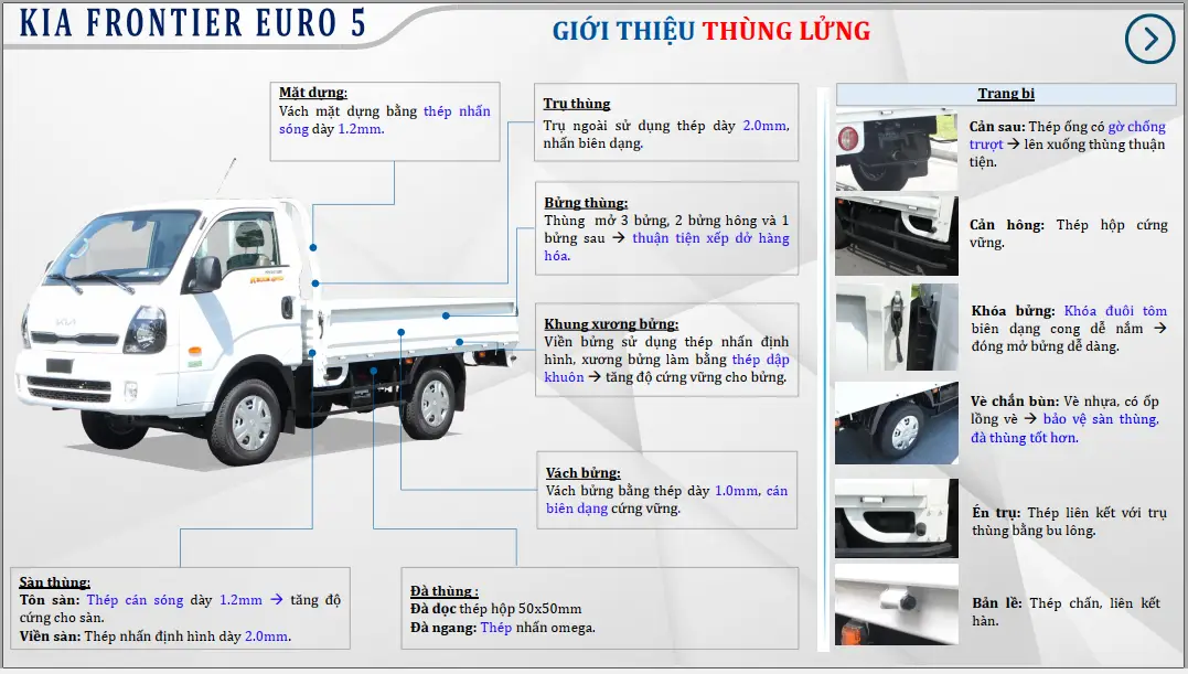 Kia Frontier K250 – Thùng Lửng, Tiêu chuẩn khí thải EURO 5, dòng sản phẩm xe tải nhẹ máy dầu thế hệ mới (Tải trọng 2,49 Tấn ) sở hữu nhiều ưu điểm vượt trội:
